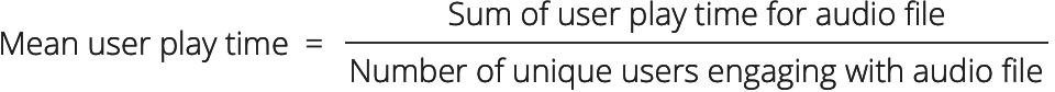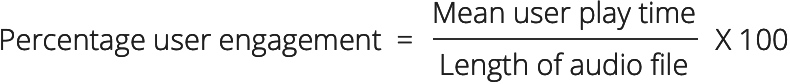 - Percentage user engagement,⁵ which refers to the proportion of the audio file that the user listens to, calculated using the following formula.